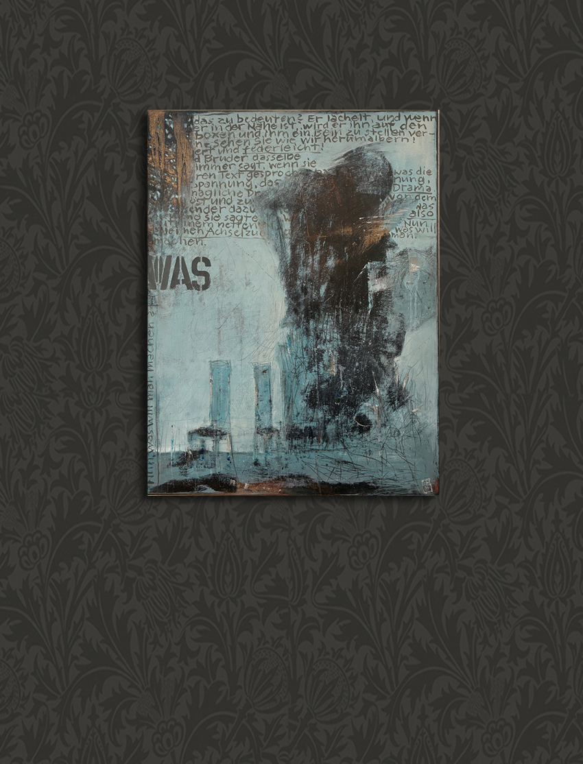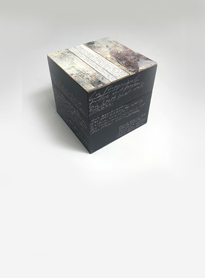 Zwei lose zusammengesetzte Holzmalkästen im Format 6x15 cm und 9x15 cm. Die Unterseite hat zwei Führungsschienen oder Magnete, wodurch die Oberseite leicht abzunehmen und wieder Aufzusetzen ist. Das obere Bild ist Ölfarbe auf Holzmalfläche gemalt und verleimt. Das Gedicht oder der Text ist um alle vier Seiten mit Pinsel oder Edding geschrieben.