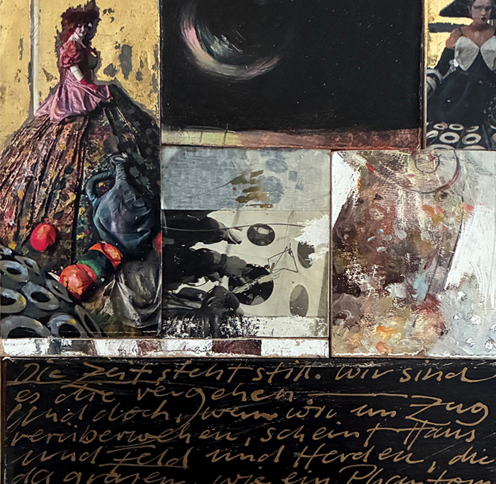 Eingebettet sind Bilder von bemalten Holzmalflächen, zusammengesetzt und eingepasst in ein altes Stück massiven Holzbohle aus Berlin. Die Kombination mit der Leichtigkeit, Zartheit und auch Verspieltheit der Bilder mit der Schwere des Holzblocks empfinde ich als Künstler sehr reizvoll.