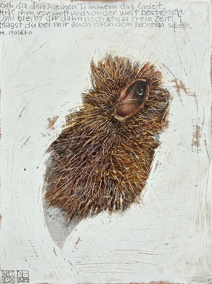 und des Innehaltens, so empfinde ich den Prozess beim Malen. Da entsteht wie von selbt eine Gestalt, ein Gefieder, ein Haus eine Farbstimmung, es gilt der Intuition zu folgen. Malen bedeutet auch, sich fallen zu lassen, aus sich selbst zu schöpfen. Eine Spur wird gefunden und dabei neue gelegt, die wiederum nicht alle gegangen werden. Man möge finden - vielleicht sich selbst.