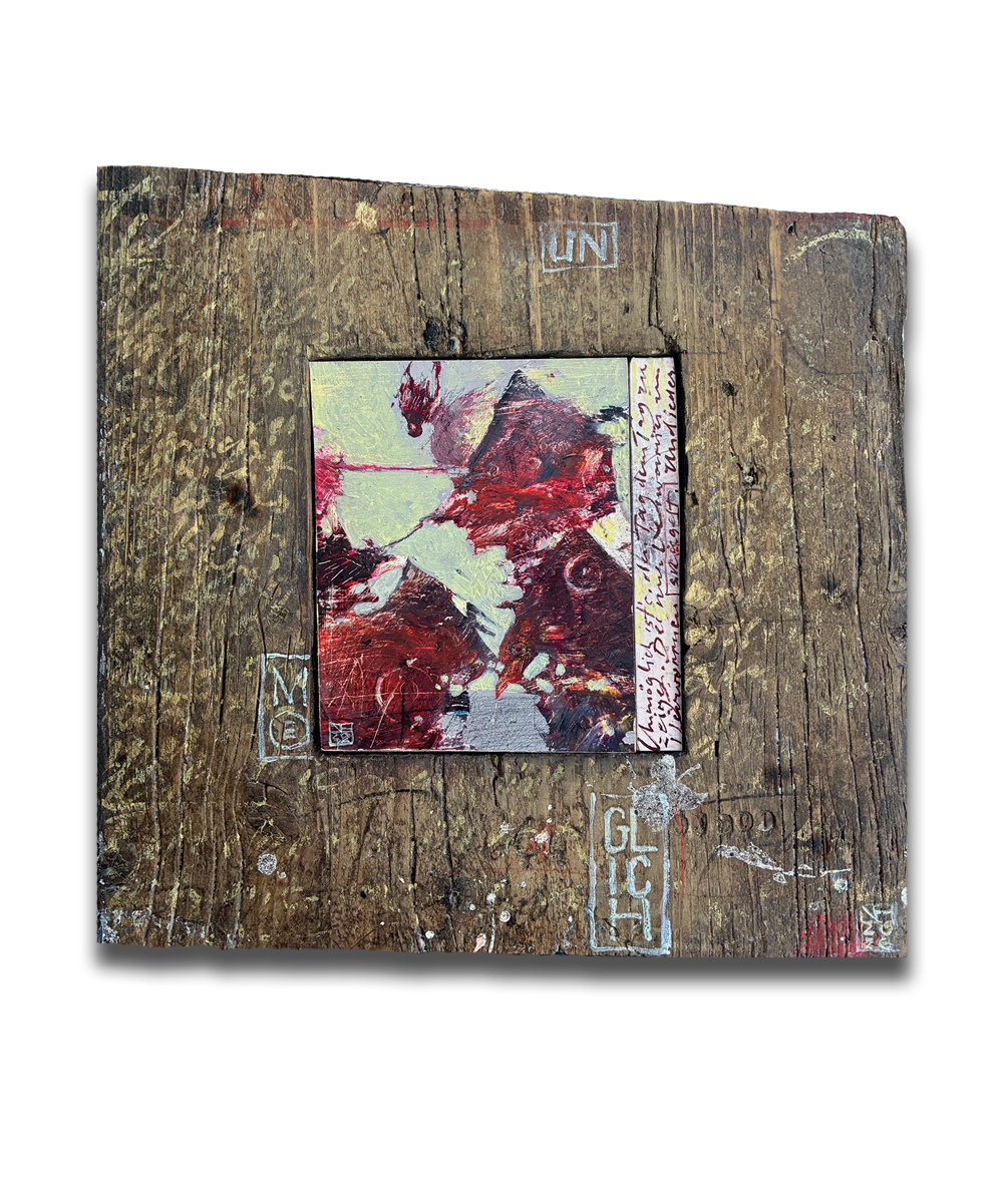 Ölfarbe auf zwei Holzmalflächen, eingepasst und im Holzblock 30,5x31,5 cm verleimt, Tiefe 5 cm. 2025