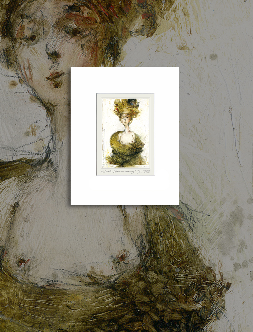 Arbeiten in Verbindung von klassischer Ölmalerei mit teilweiser Blattgoldunterlegung auf Holzmalfläche 11x16 cm. Eingebettet in ein Passepartout 30x40 cm, schaffe ich einen Raum für eine malerische und eine poetische Ebene. Verschiedene Themen, wie die 4 Jahreszeiten, Faces, Bäume, Traumbilder und die Verbindung mit Gedichten und Texten.