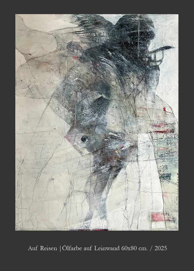 Ein Moment der Stille und des Innehaltens so empfinde ich den Prozess beim Malen. Da entsteht wie von selbt eine Gestalt, ein Gefieder, ein Haus eine Farbstimmung, es gilt der Intuition zu folgen. Malen bedeutet auch, sich fallen zu lassen, aus sich selbst zu schöpfen. Eine Spur wird gefunden und dabei neue gelegt, die wiederum nicht alle gegangen werden.