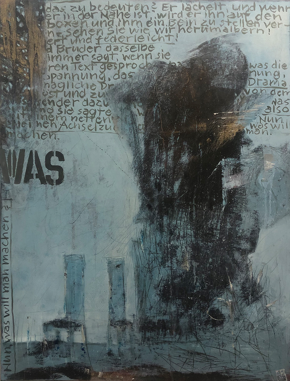 Zwei lose zusammengesetzte Holzmalkästen im Format 6x15 cm und 9x15 cm. Die Unterseite hat zwei Führungsschienen oder Magnete, wodurch die Oberseite leicht abzunehmen und wieder Aufzusetzen ist. Das obere Bild ist Ölfarbe auf Holzmalfläche gemalt und verleimt. Das Gedicht oder der Text ist um alle vier Seiten mit Pinsel oder Edding geschrieben.