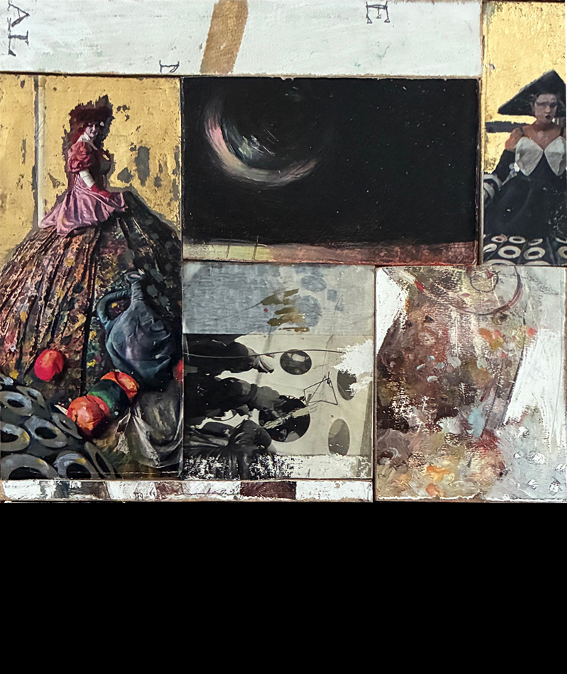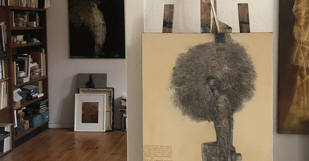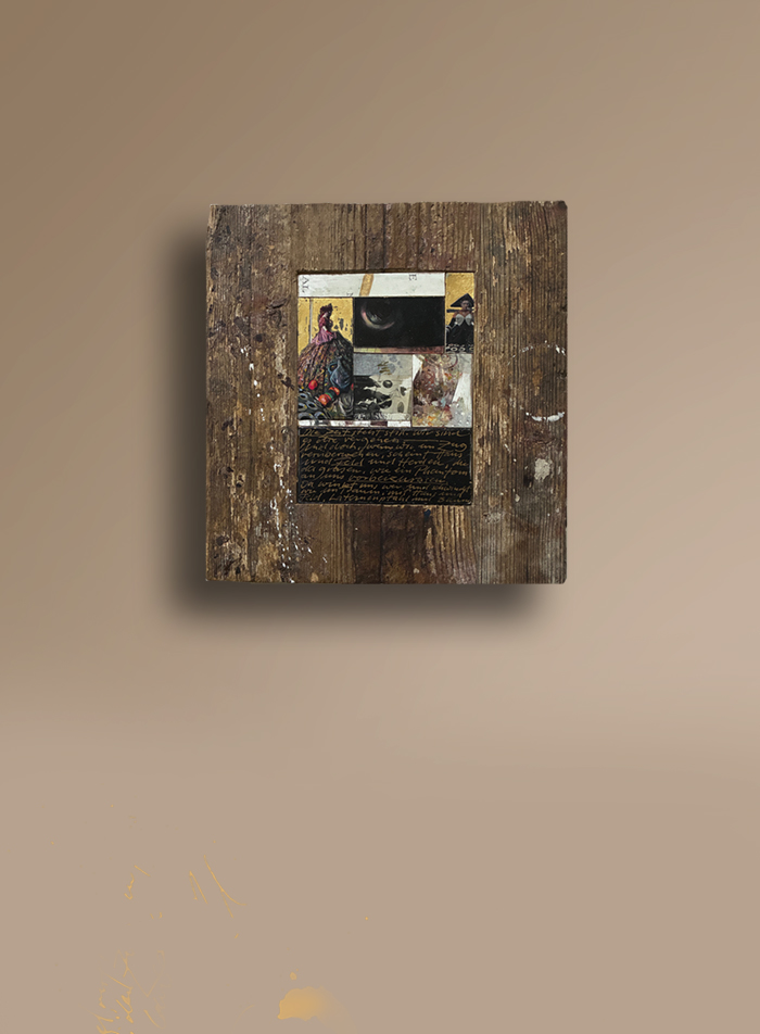 Eingebettet sind Bilder von bemalten Holzmalflächen, zusammengesetzt und eingepasst in ein altes Stück massiven Holzbohle aus Berlin. Die Kombination mit der Leichtigkeit, Zartheit und auch Verspieltheit der Bilder mit der Schwere des Holzblocks empfinde ich als Künstler sehr reizvoll.