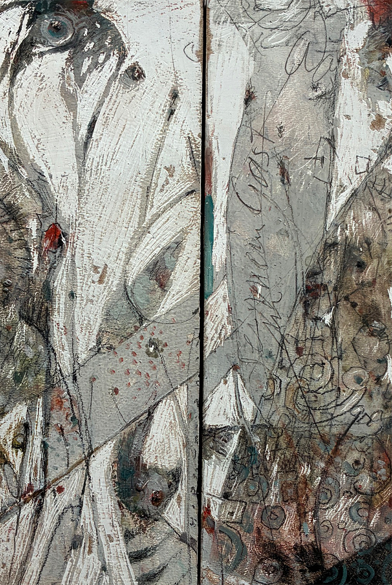 Ein Moment der Stille und des Innehaltens, so empfinde ich den Prozess beim Malen. Da entsteht wie von selbt eine Gestalt, ein Gefieder, ein Haus eine Farbstimmung, es gilt der Intuition zu folgen. Malen bedeutet auch, sich fallen zu lassen, aus sich selbst zu schöpfen. Eine Spur wird gefunden und dabei neue gelegt, die wiederum nicht alle gegangen werden, so ist das Bild letztlich eine Reduzierung auf das Wesentliche in sich selbst.