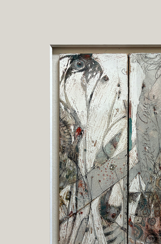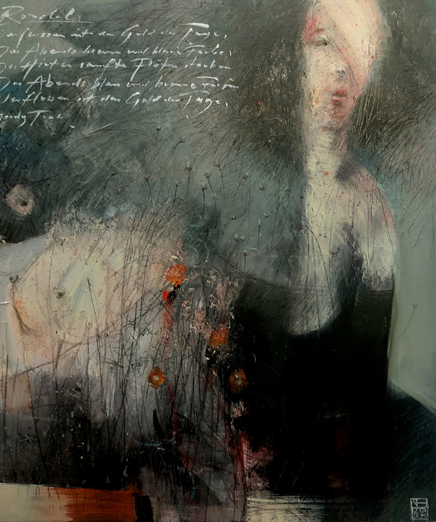 Arbeiten in Verbindung von klassischer Ölmalerei mit teilweiser Blattgoldunterlegung auf Holzmalfläche 11x16 cm. Eingebettet in ein Passepartout 30x40 cm, schaffe ich einen Raum für eine malerische und eine poetische Ebene. Es gibt verschiedene Themen, wie die 4 Jahreszeiten, Faces, Bäume, Traumbilder und die Verbindung mit Gedichten von Hermann Hesse, Eva Strittmatter, Mascha Kaléko, G. Trakl ua.